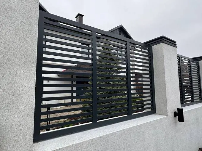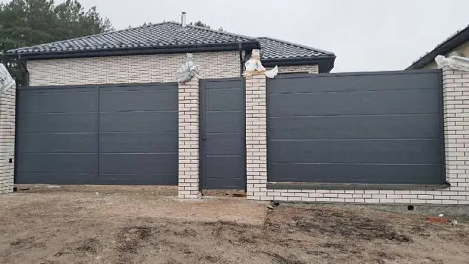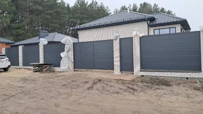 Ограждения, с заполнением алюминиевым профилем (широкий 82 мм), калитка (секция Prestige, цвет RAL7016, серый антрацит) и откатные ворота.